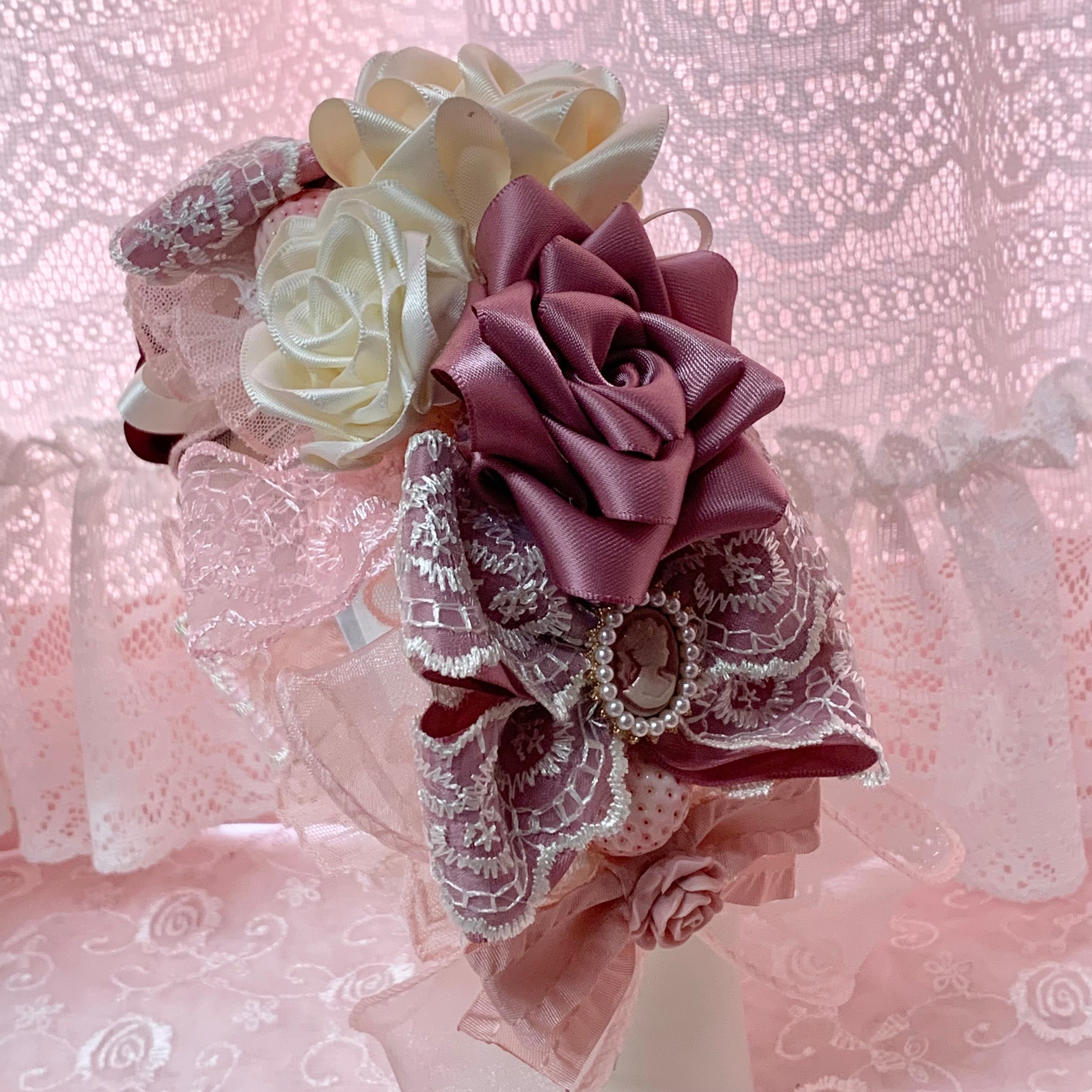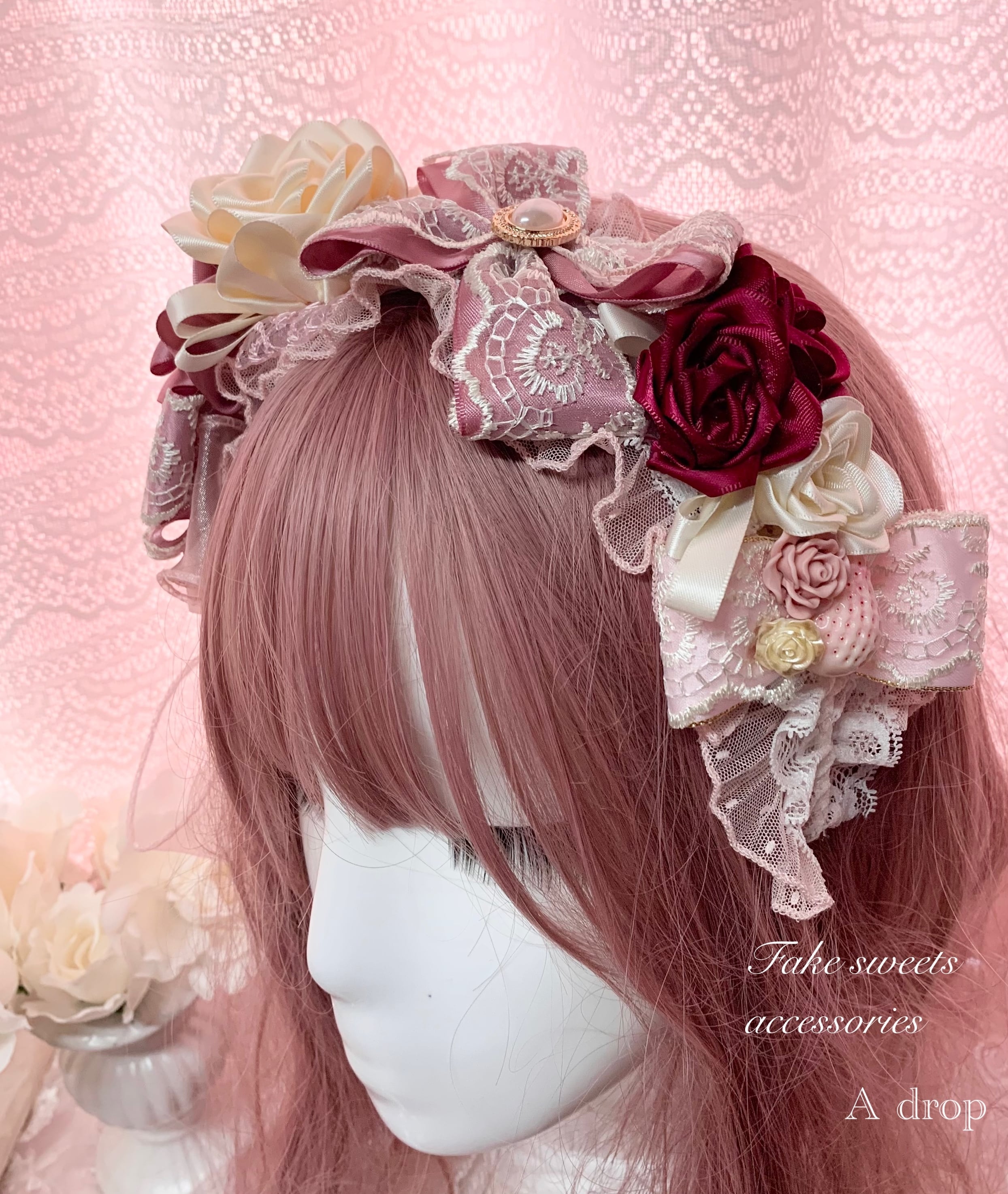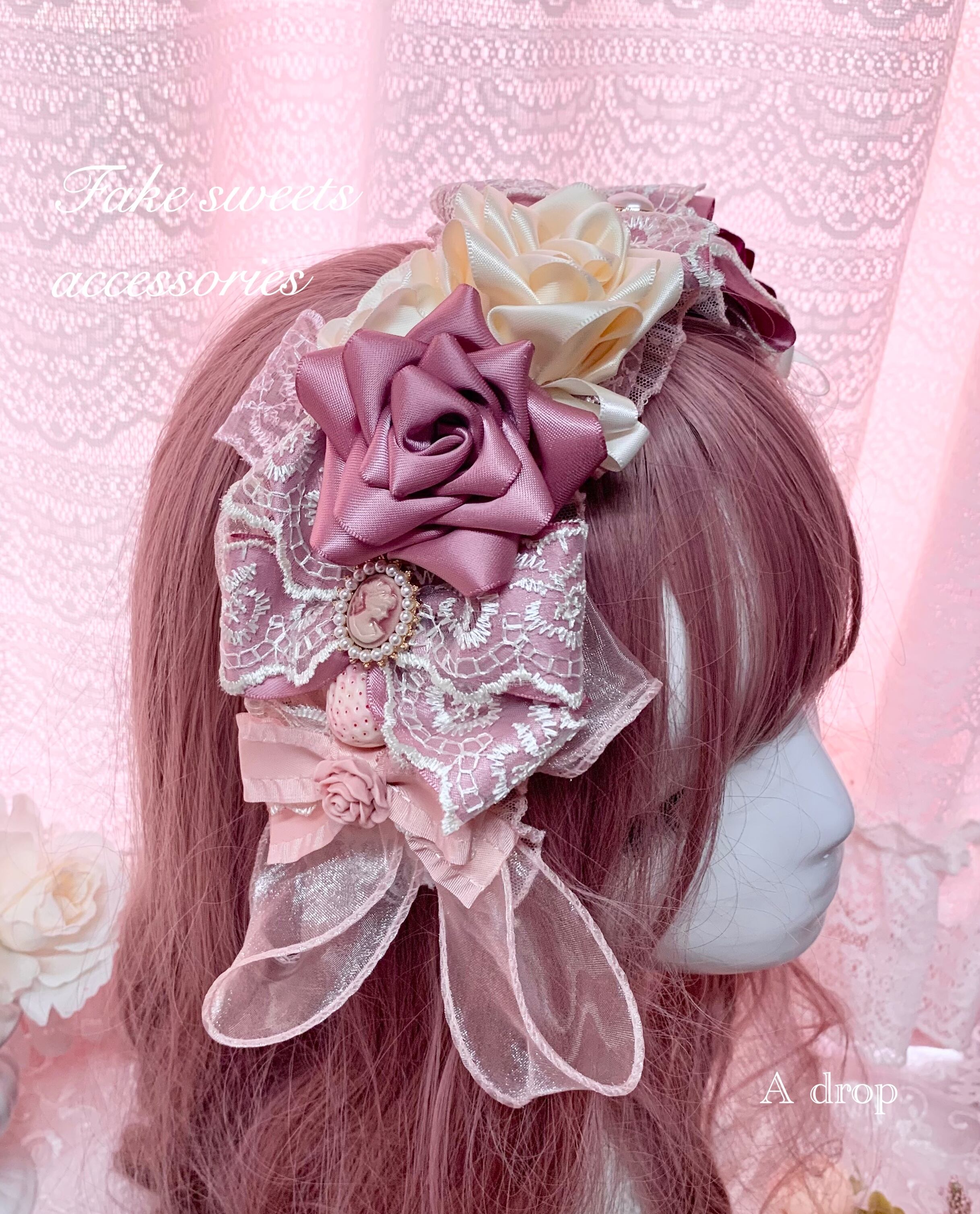 (ハンドメイド フェイクスイーツ 苺 いちご 薔薇 バラ リボン カメオ カチューシャ ヘッドドレス ロリータ ロリィタ クラロリ クラシカル ロココ エレガント パーティー )